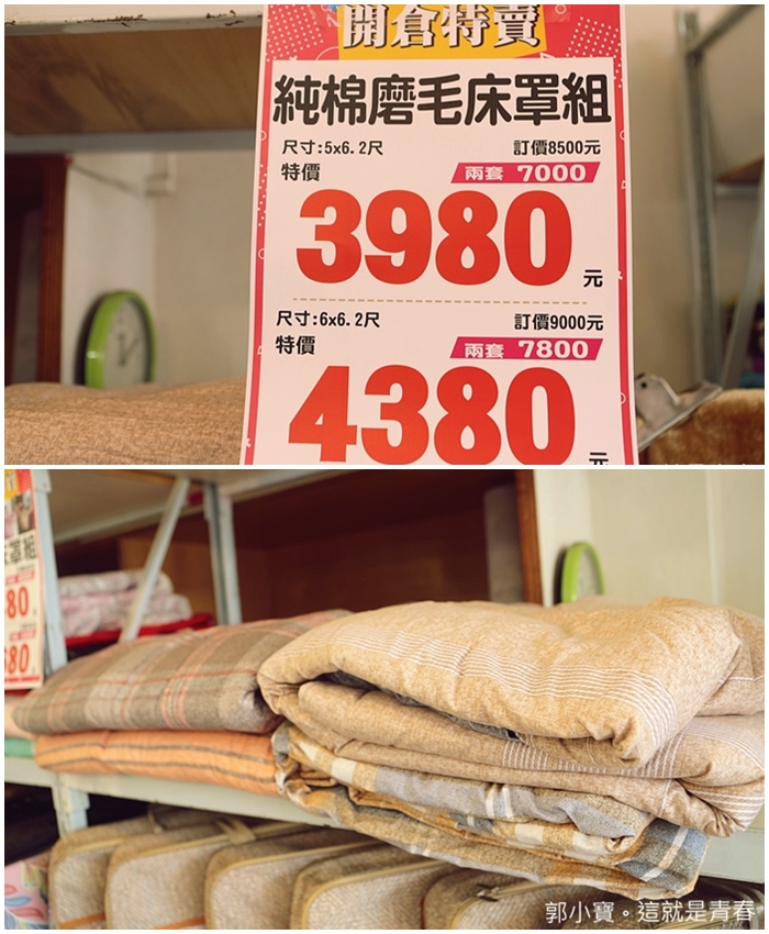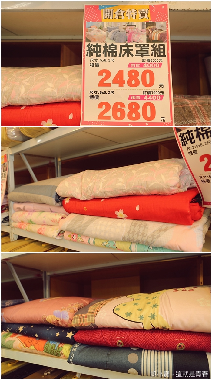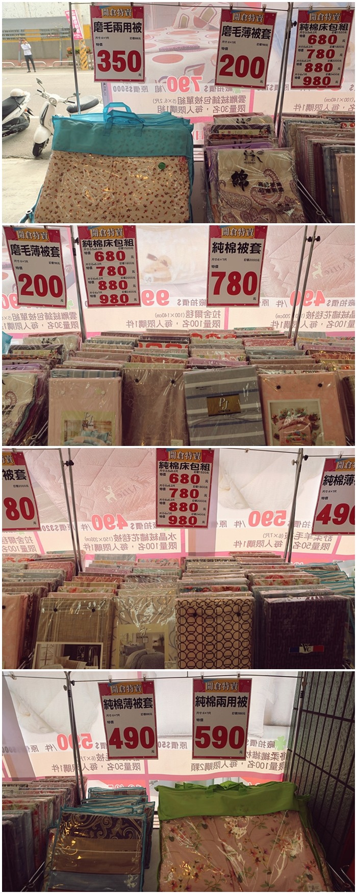 | 各式各樣的商品全部都不打算送回倉庫了,四季寢飾應有盡有,很多商品都在幾百元內就可以入手,一年一度的大甲開倉出清真的不要錯過,買到賺到的好機會,保證讓大家買到不要不要的。 |