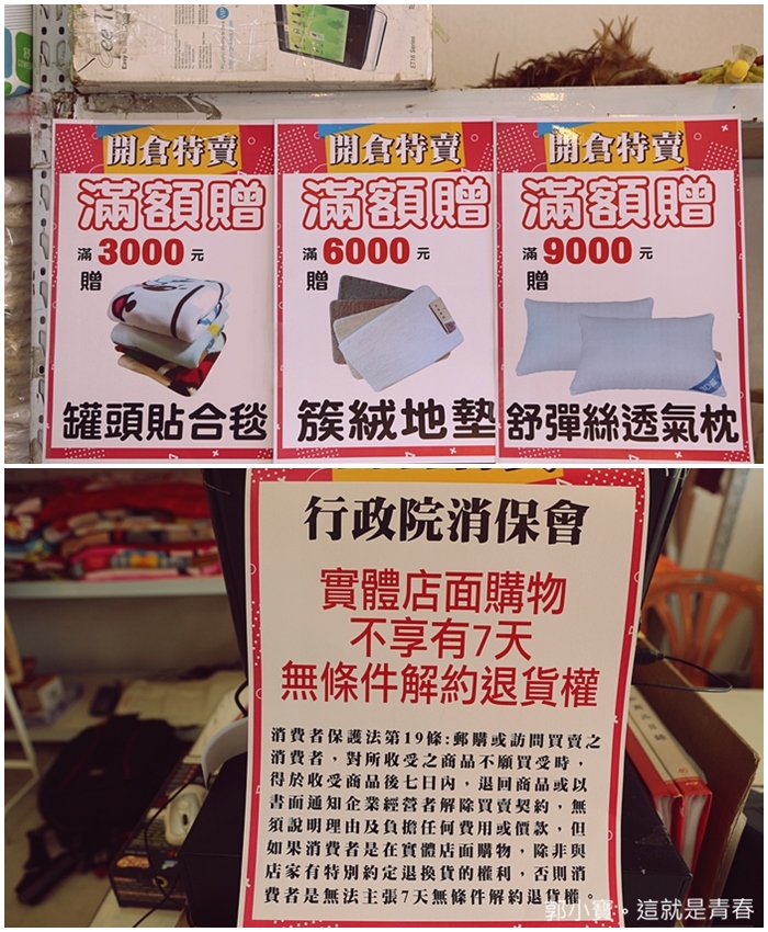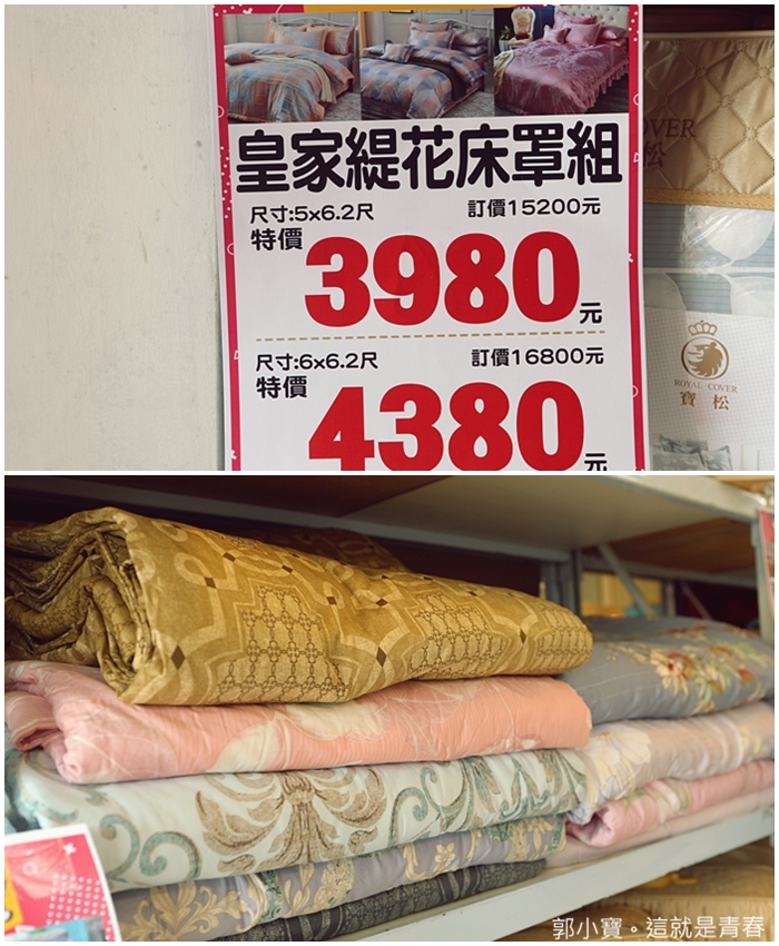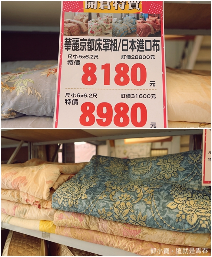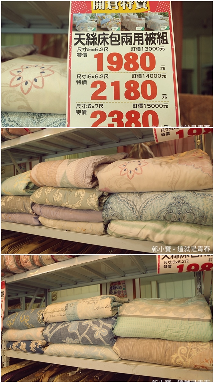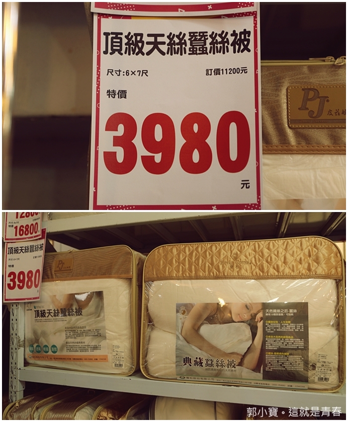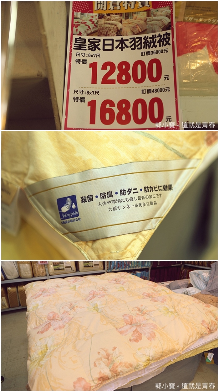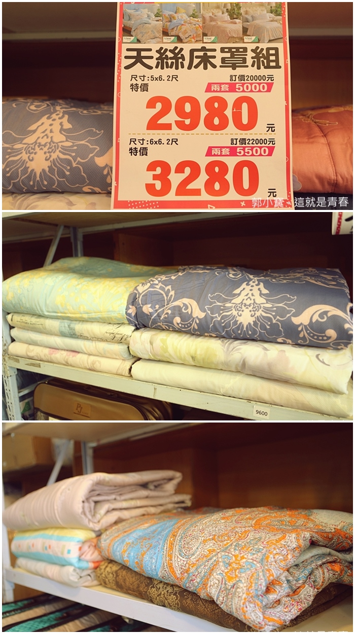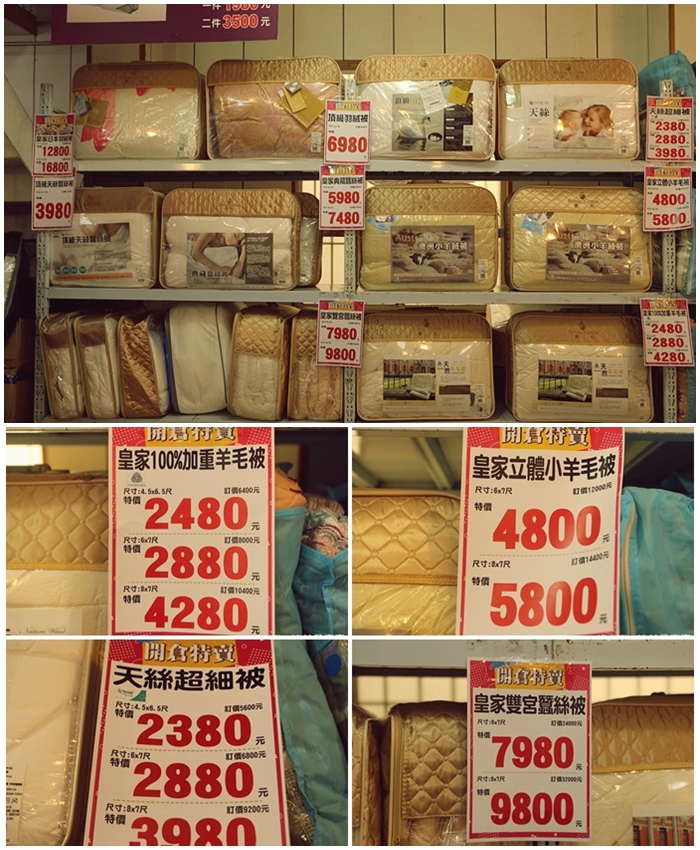 | 現場各式各樣的棉被通通都是低於市價非常多的價格在出清,如果喜歡純蠶絲被的朋友也不要錯過,這邊通通都有貨,但是還是要再三跟大家分享,最好一定要到現場摸摸看體驗看看他們家的品質,跟坊間還有網路上的完全不一樣,質感跟品質超級棒。 |