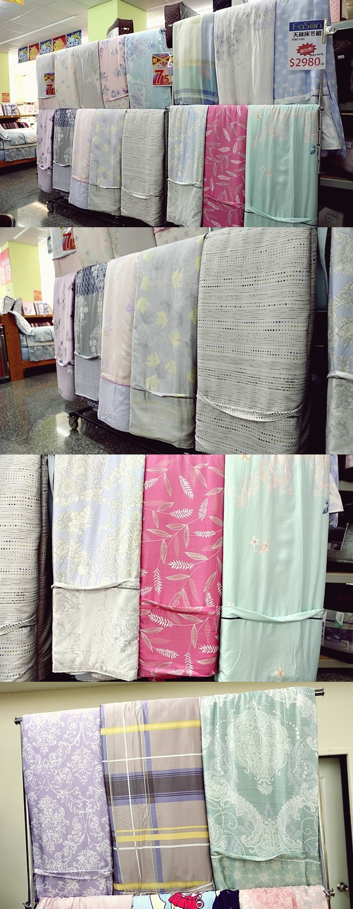 | 各式各樣的布料床罩組通通都有,有機會推薦大家真的可以入手埃及棉的床罩組,睡起來的舒適性比天絲還要好,且親膚性極佳,對於皮膚比較敏感的人很適合入手。 |