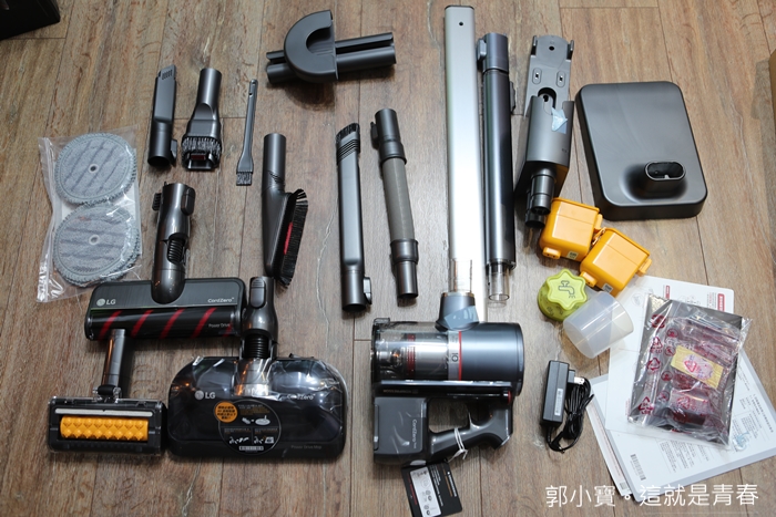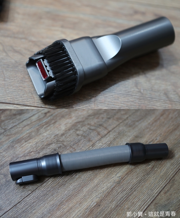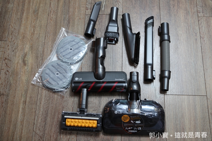 | 這個套組算是大全配了,剩最頂配的寵物吸頭沒有入鏡,三大吸頭通通有在裡面,濕拖頭、塵蟎吸頭、跟地板吸頭通通都有備配在裡面以外,還有整理汽車跟角落的縫隙吸頭也一應俱全,最好用的就是這次配備的伸縮軟管,不會打掃到腰酸背痛,其他的吸頭我就比較少用到了。 |