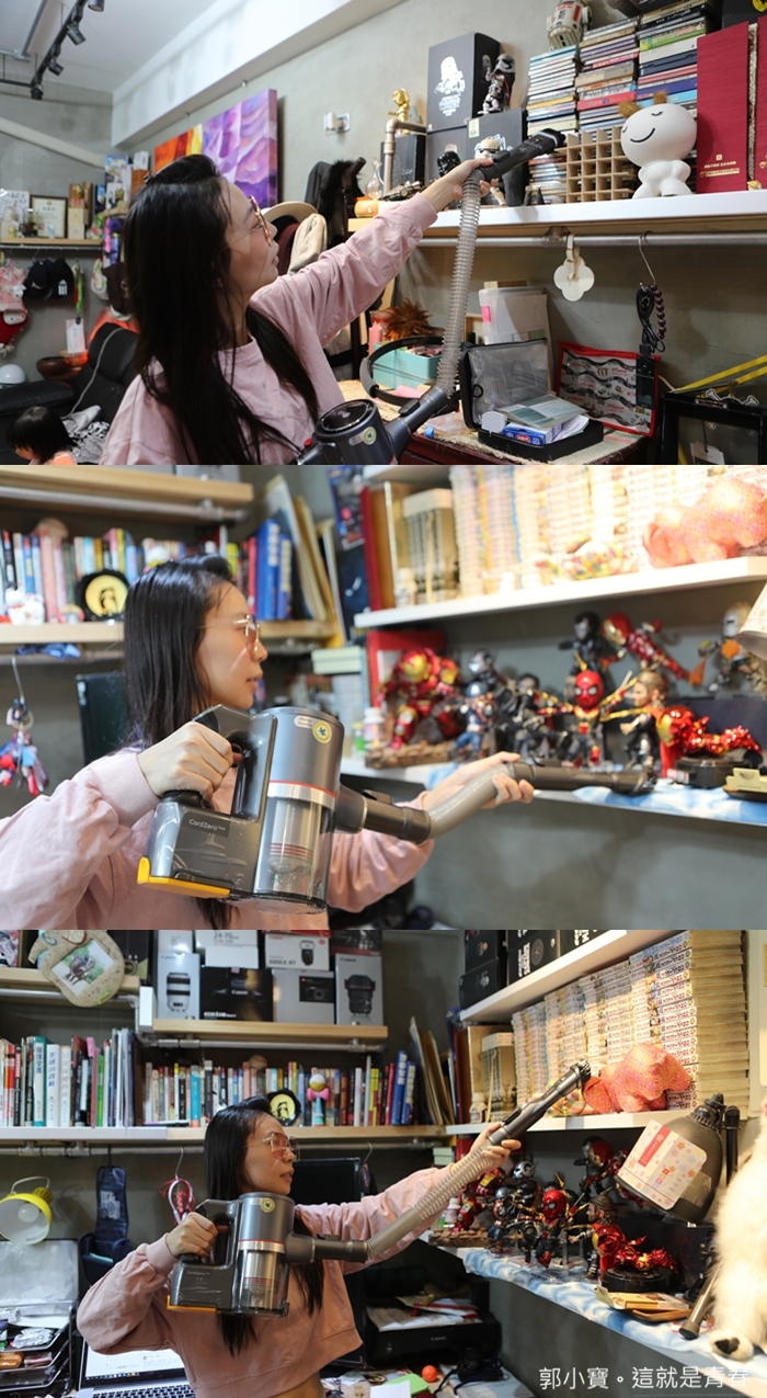 | 還有我的書櫃跟公仔也都是使用二合一的毛刷處理,通常這些都是直接放在我的工作桌旁,所以還滿容易積灰塵的,對於清潔不規則的物品時非常好用的吸頭。 |