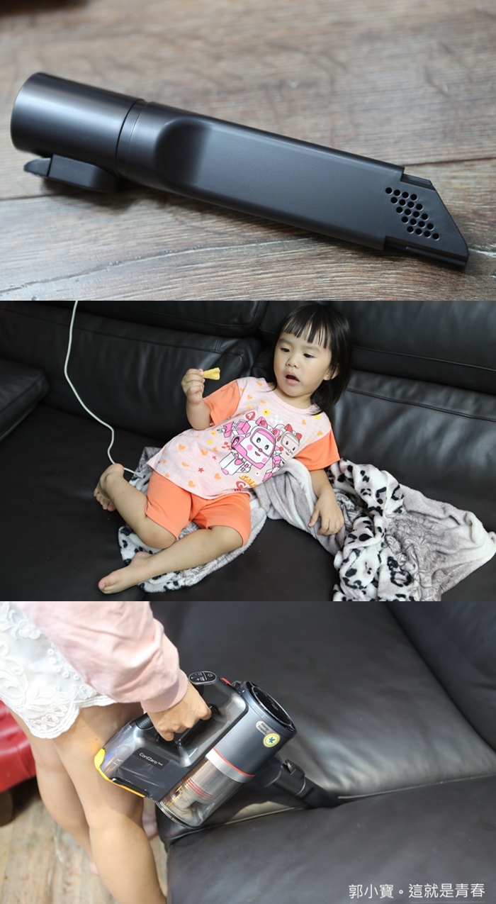 | 隙縫吸頭也是必備,因為自從有了Cola之後,家裏面四處都是她掉落的餅乾屑,所以沙發底下就一定要隙縫吸頭伸入打掃,另外最常出現的地方就是車上了,兩顆電池版本幾乎打掃完一整台車子電力都很夠,吸力又比外面的投幣吸塵器強大多了。 |