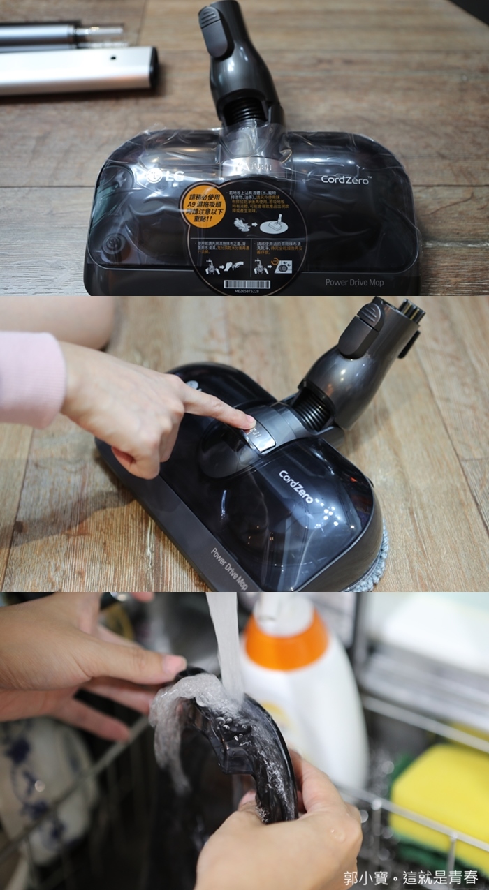 | 木質地板可以使用一段水量較少,濕拖吸頭我覺得很好用,而且A9K系列把濕拖頭的缺點又強化了,拖起來的感覺很像是以前小時候在用打蠟機打蠟的感覺。 |