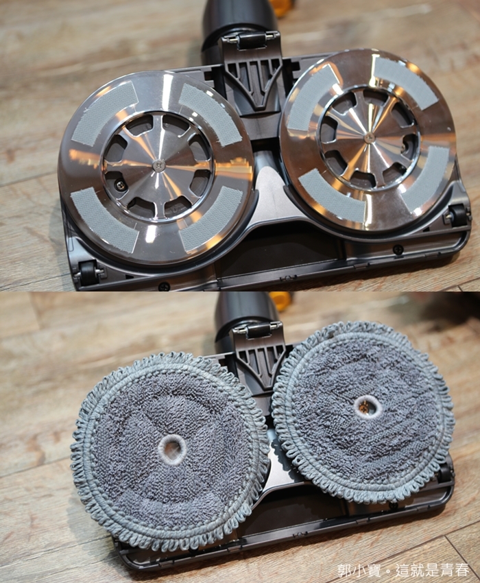| 吸頭底部有兩個旋轉盤,將A9K吸塵器附贈的地板布貼上後就可以了,抹布總共有四片可以替換,這一年來我在拖地前都會先用酒精噴過。 |