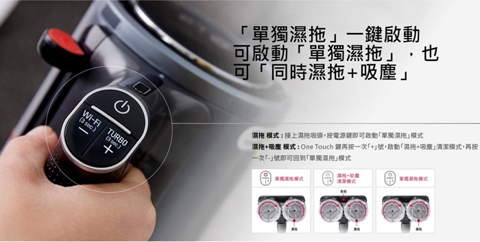 | 濕拖吸頭可以採用電控注水的方式,可以手動切換出水量(無-一段-二段)。 |