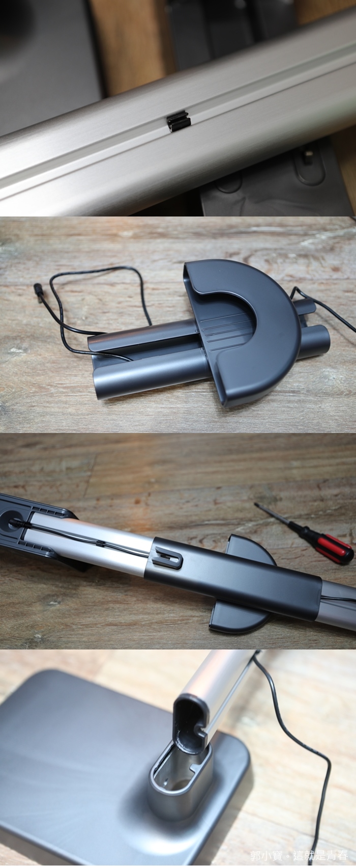 | 組裝底座一點都不難,唯一要注意的就是因為現在多了濕拖頭的放置架,所以第一個步驟就是一定要先把電源線先拉好,再安裝其它部分跟插上底座,就這線就可以收得很漂亮,隱藏在支架裡面!! |