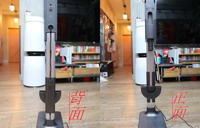 | 直立式基地座充站的底座加重,所以相當堅固也不會因為碰撞就倒下,重點是因為本身底座就加重,所以不用破壞牆面釘牆固定,光這一點就超貼心,且除了主機以外還可以吊掛三款常用吸頭。 |