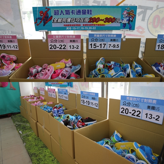 | 這一區超多媽媽在這邊搶貨,超流行又可愛的卡通童鞋,很多都是有LED設計的發光童鞋,各種卡通人物都有,全部都是原版授權, 只要$290~390不等,小朋友的腳真的大得滿快的,來這邊入手童鞋真的省很大。 |