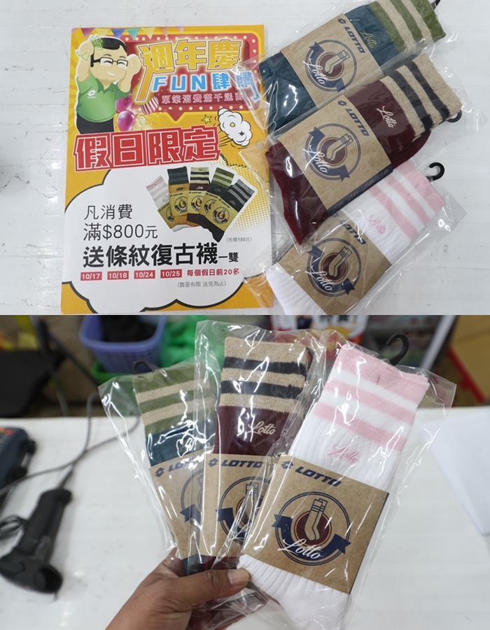 每個假日前20名現場凡消費滿800元即贈送條紋復古襪一雙, |