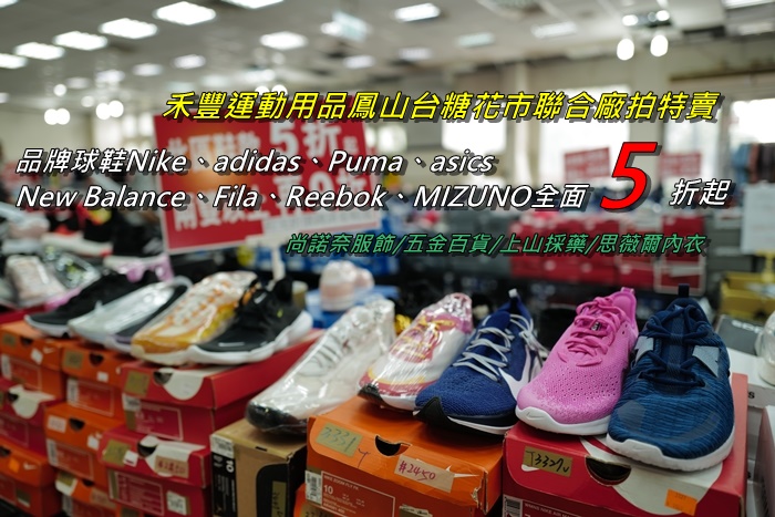 過年最期待的特賣會來了,每年過年都擠爆人潮的鳳山台糖花市目前有禾豐運動用品跟尚奈諾服飾舉辦聯合廠拍,各式各樣的商品通通都是特賣價格,場地非常的大,數百坪的空間加上琳瑯滿目的商品,真的很值得鳳山民眾可以趁著新春期間趕緊衝一波搶好康,加上這次的優惠真的很殺,很多品牌商都是直接廠拍優惠價拋售,絕對讓你買到不要不要的。