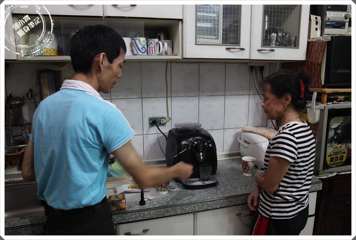 寶媽為了一次學習就OK,還非常慎重的帶起了他的老花眼鏡,他對這一台全自動咖啡機也有著無比的好奇心。 |