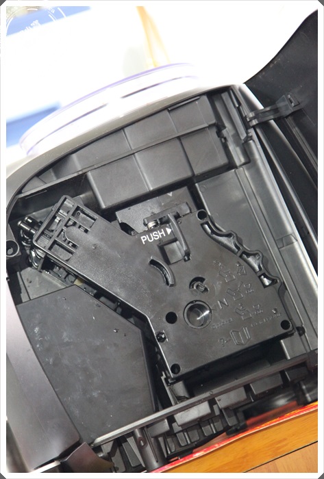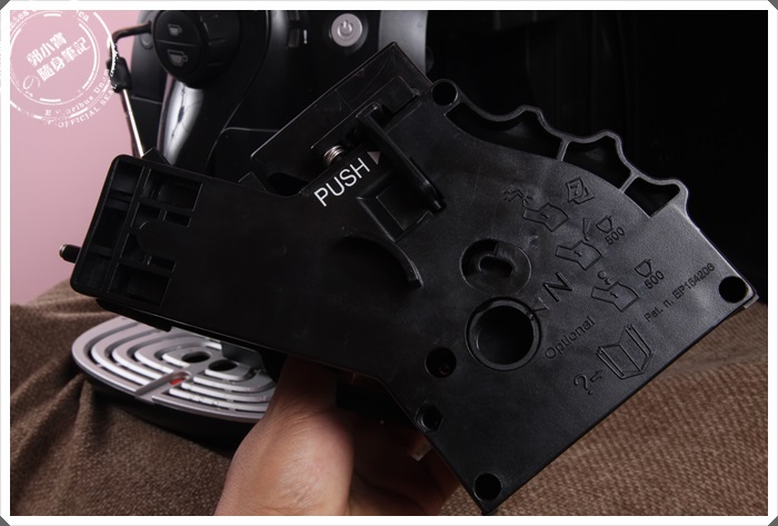 | 打開咖啡渣的背蓋就會看到咖啡蒸餾沖泡器,上面印有個PUSH的字樣,只需要大拇指按壓後就可以輕鬆取下。 |