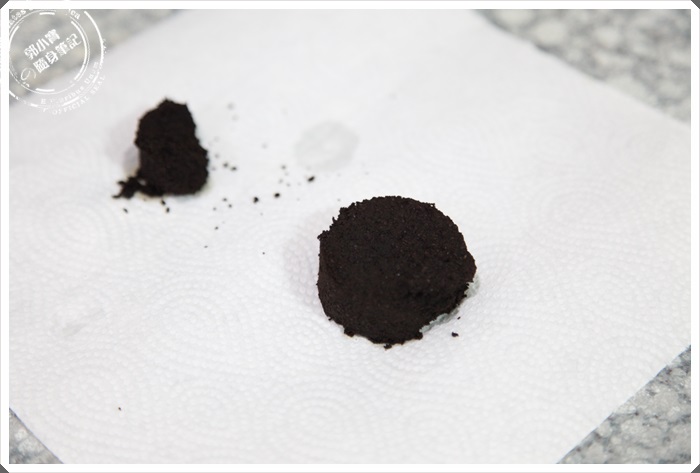 | 接下來看一下一開始的時候小寶跟大家提到的咖啡餅渣,可以看到收集盒內的咖啡餅渣一塊塊都非常的完整,也只有在高壓的技術下才有辦法這樣填壓的非常密實。 |