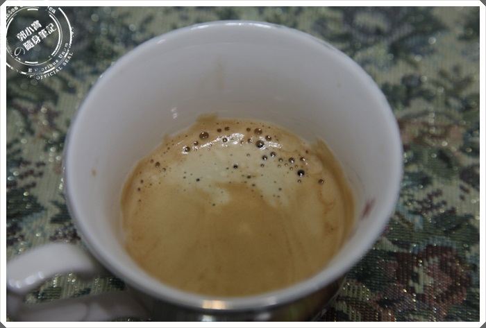 | 看一下杯中的咖啡,這麼豐厚的Crema幾乎只有現磨的咖啡才有辦法啊!!! Crema就是萃取咖啡所產生的精華乳泡油脂,咖啡表面上的那一層就是了。 |