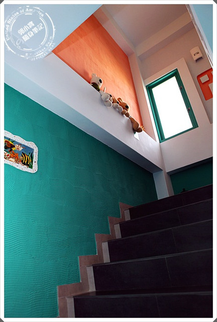 | 雖然有電梯,但是我還是沿著樓梯上樓,樓梯牆面大量使用不同暖色系的顏色,加上大量的玩偶童趣,