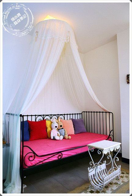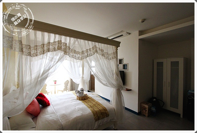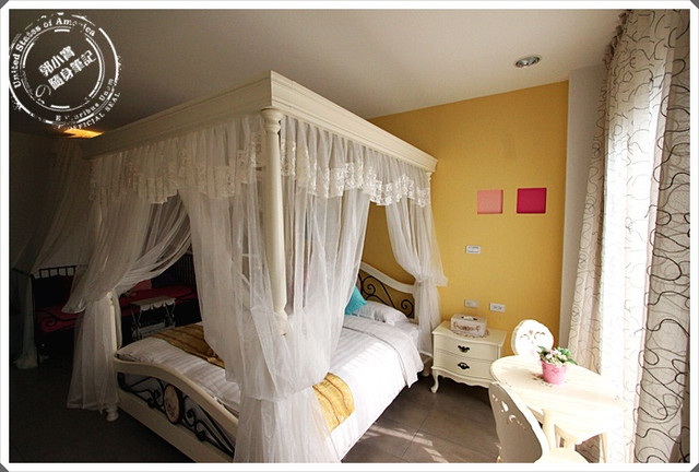 這根本就是歐式城堡可愛風的房間,除了有女性喜愛的大量白紗帷幕以外,連床尾都還有雕花跟印圖設計,
