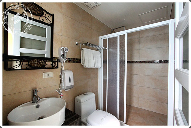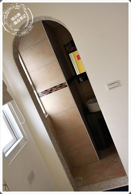 浴室入口是個小拱門造型,理面沒有浴缸,簡單的乾濕分離的淋浴間,浴室特色就沒有那麼明顯了,