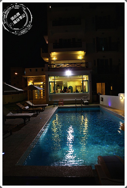 大片的綠草原,澎湖熱情的陽光,清澈的泳池閃耀的黃光,天空很藍,白雲朵朵,微風徐徐,
