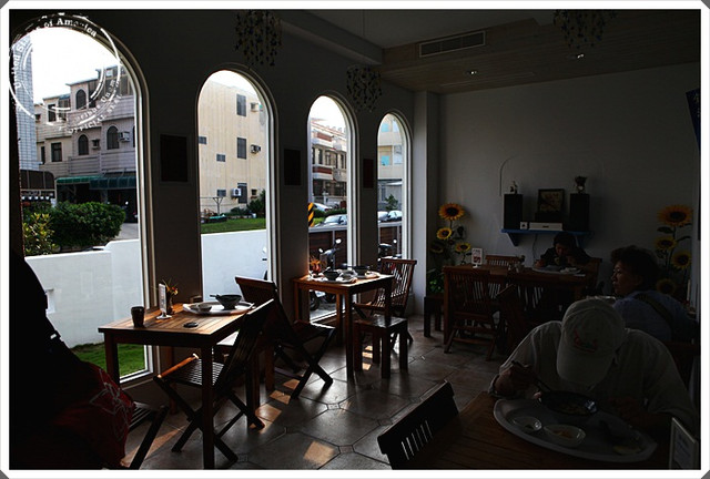 白日夢民宿的餐廳一偶,餐廳裡面放著南洋音樂,輕鬆而優閒的氣氛,拱門造型的落地窗,吃的卻是台灣小吃,
