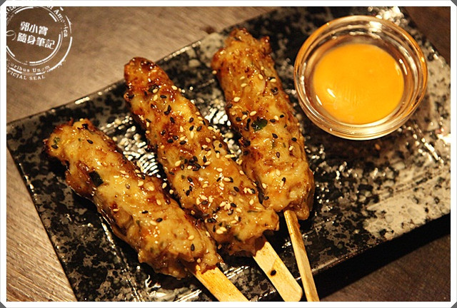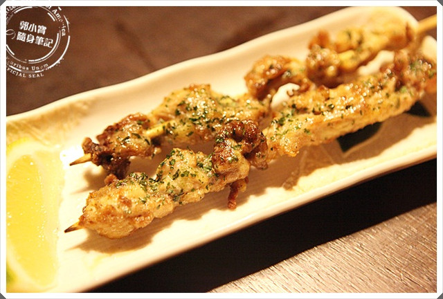 多汁的雞肉串撒上些許海苔粉,味道美味.
