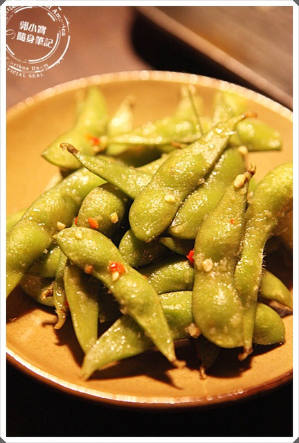 一座上位子就送上來的招待的毛豆,與一般的冰毛豆不同,辣椒與毛豆拌炒過,上盤時候氣味逼人,