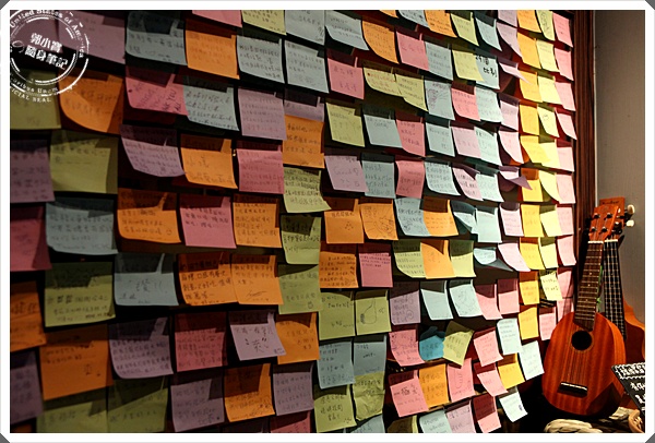 牆上滿滿的便利貼留言,旁邊的小吉他是真的可以彈的,