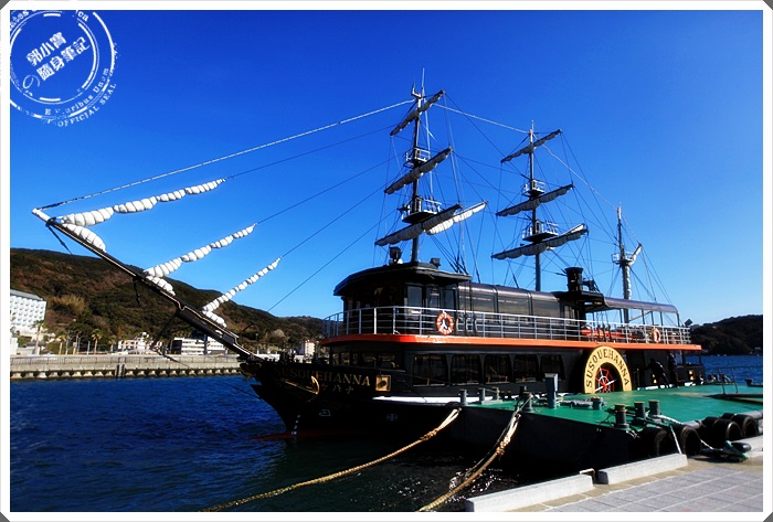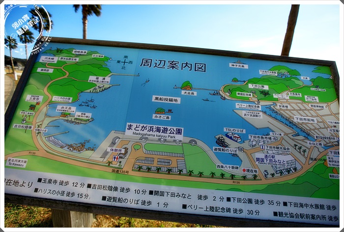 來到下田這麼有歷史性的地方,當然最引人注目的就是黑船了,整個下田的觀光景點幾乎都圍繞著這個海灣,中間就是海遊公園,下方清楚的標示了走到各個景點所需要花費的時間,來到這邊當然最不能錯過的當然就是直接搭黑船出海,一覽下田灣的風光明媚。