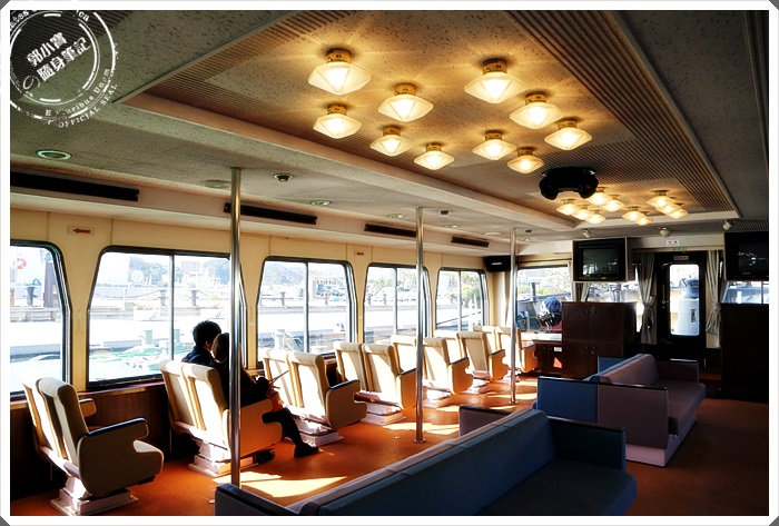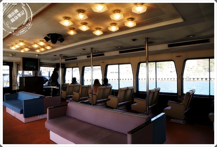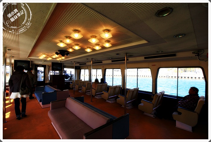 | 船艙內的座位數挺多的,還有兩條大沙發可以坐,裡面裝潢得滿溫馨的。幸好當天的天氣不錯,太陽公公有露臉,雖然當時是冬天吹來的海風非常冷,但是有了太陽公公的加持就好多了。 |