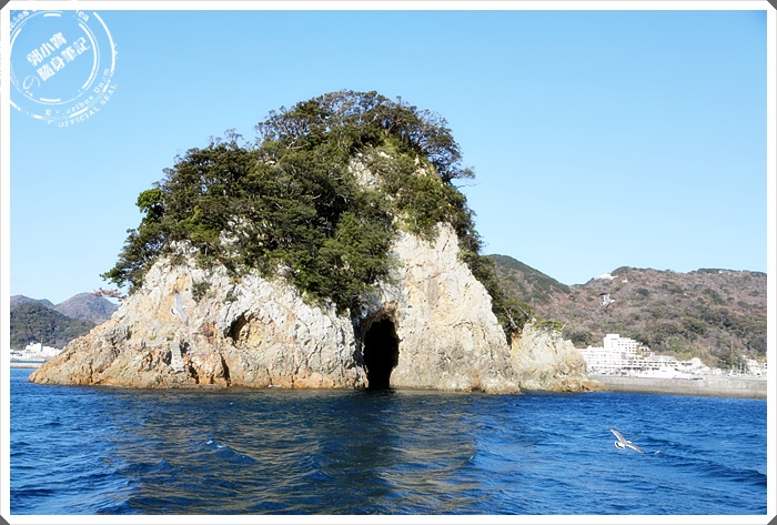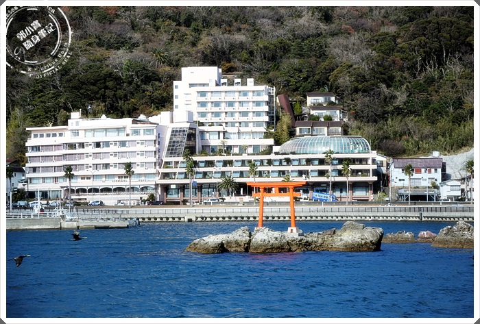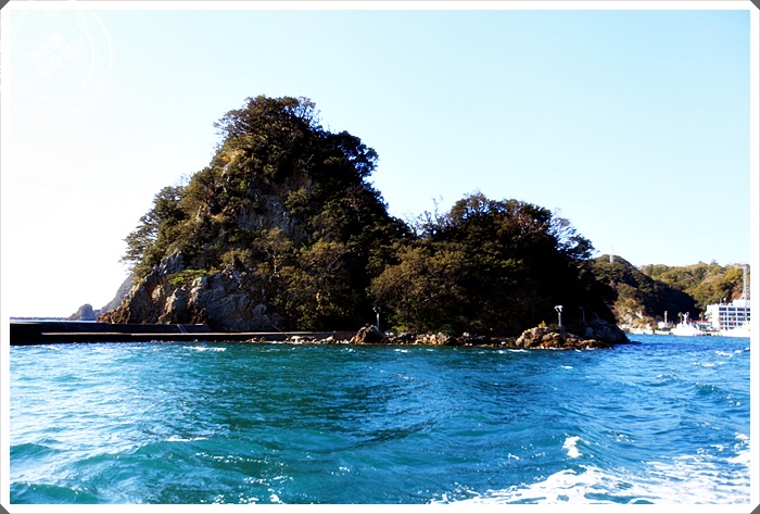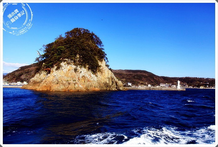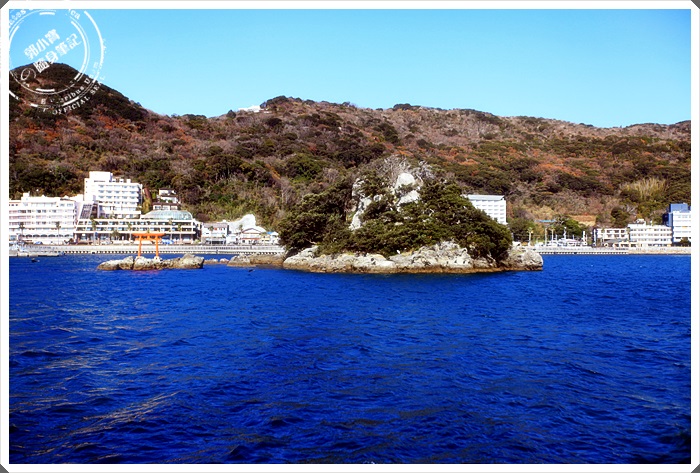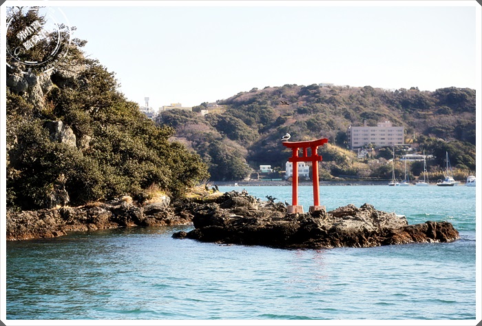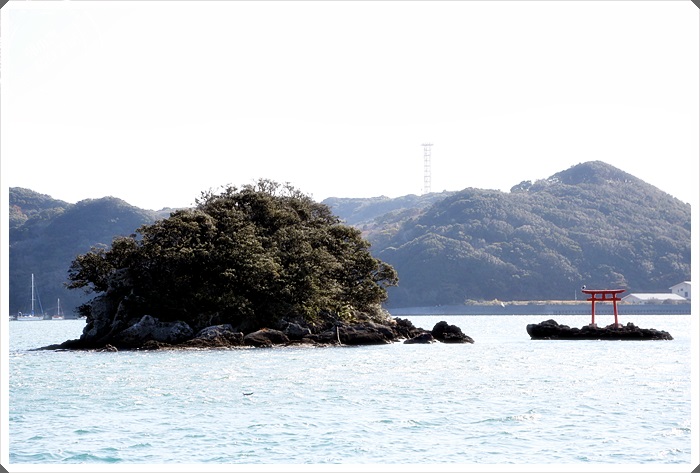 | 遠遠就看到海上的這一座小島,旁邊還有一個紅色海上小鳥居。 |