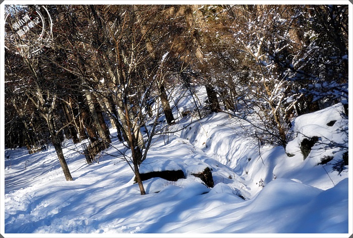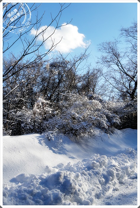 | 雖然人煙稀少,但是政府每天固定時間還是會來開路,看看兩側的雪就知道這幾天的雪量有多少了,堆疊的大概有半個人那麼高,我們兩個其實都很不怕死,這次來五湖都往人煙稀少的地方走。 |