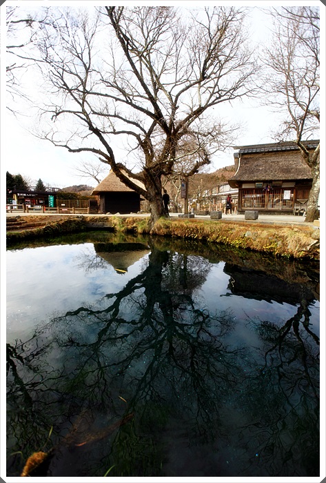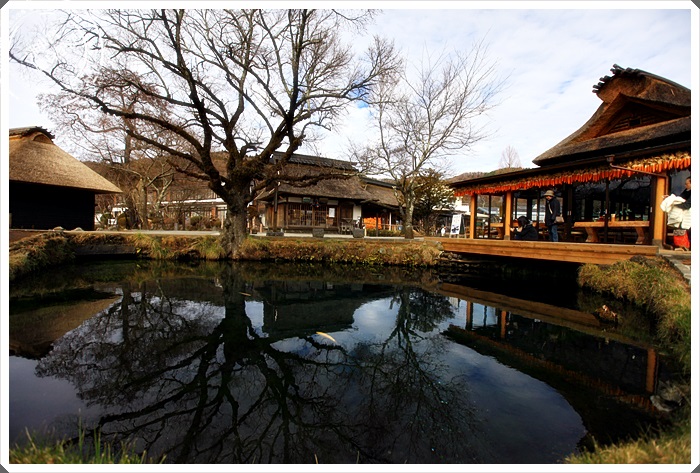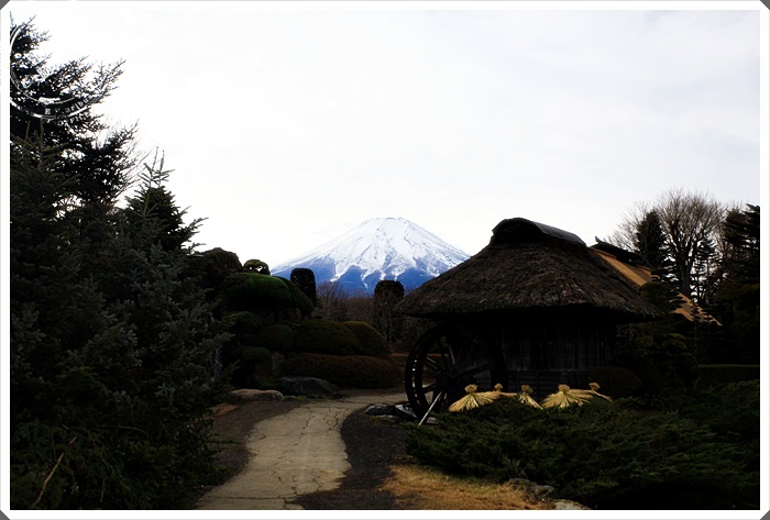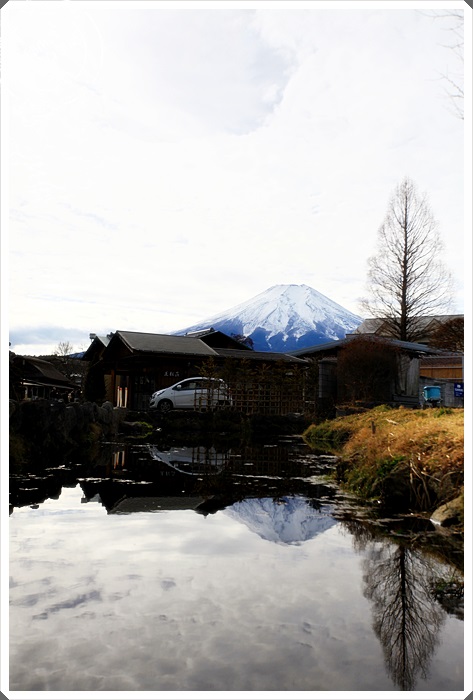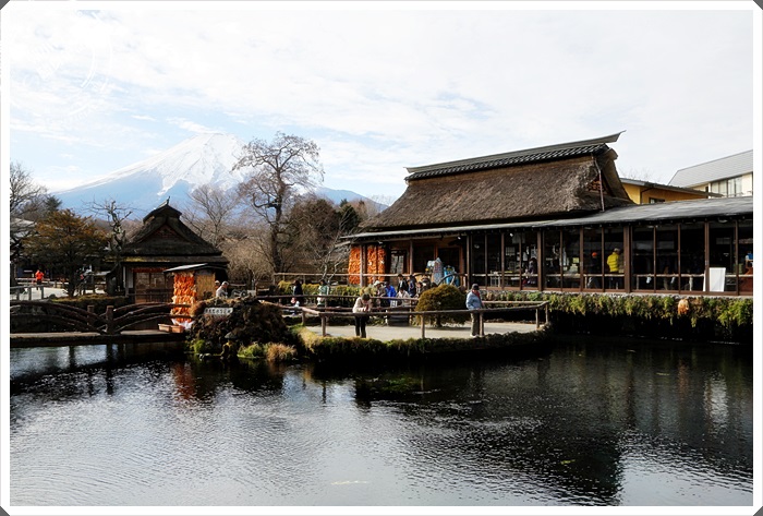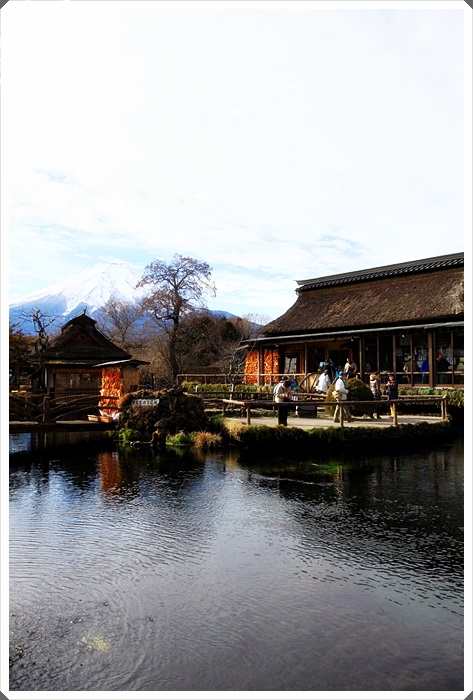 | 進入入口看印入眼簾的風景真的讓人心曠神怡,但是這個湖水並不是底拔池,這也是人工的水池,接了神之水跟濁水的引流灌滿這水池,理面養了很多魚,背後的富士山看起來如此雄偉,倒印著茅草屋跟富士山,還有藍天白雲真的美呆了。 |