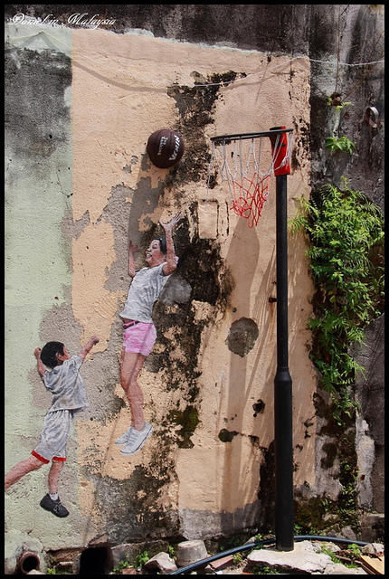 | 小朋友打籃球的壁畫,還結合了籃框、在牆壁間鑲了一個籃球所繪成,另類的3D藝術創作, |