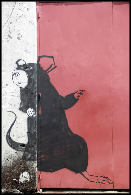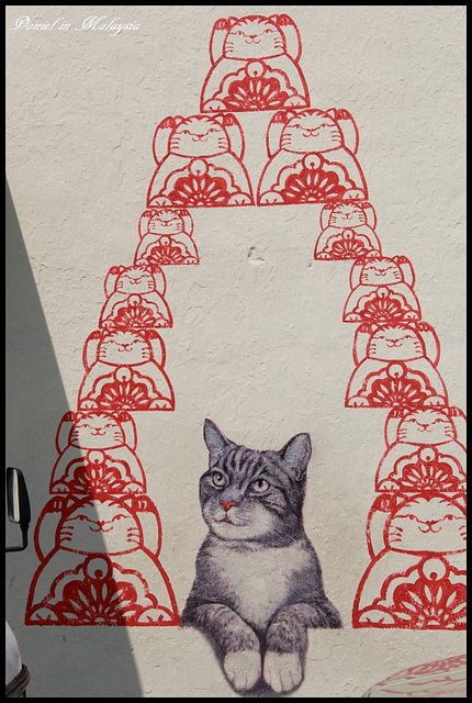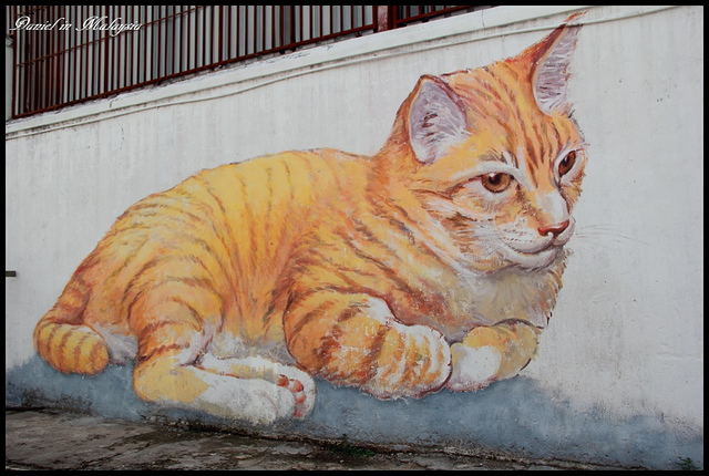 | 藝術街內亦有許多以貓為主題的設計畫作,上圖兩個畫是算同一幅,因為鏡頭不夠廣又有很多障礙物所以只能分兩張照片,這幅是貓抓老鼠為主題,有趣的是老鼠躲在牆角處逗趣的模樣非常好玩, |
