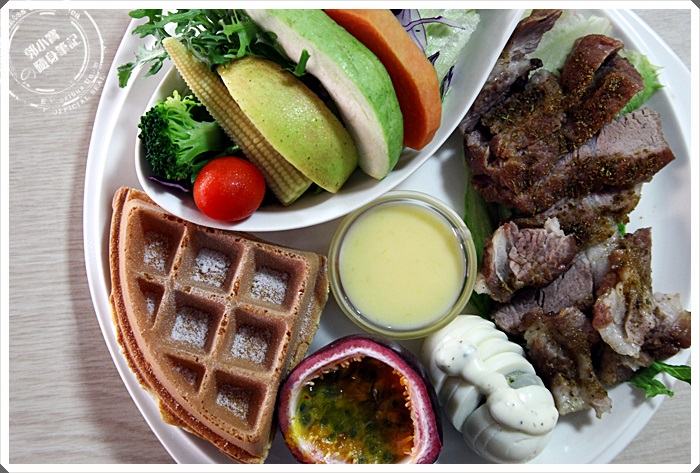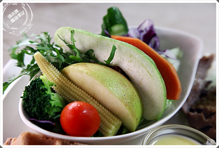 | 水果跟生菜是放在一起的,水果給的相當的豐盛,搭配著蔬菜一起食用,店內也有提供各式的沙拉醬,這樣一整頓吃下來真的超飽的。 |