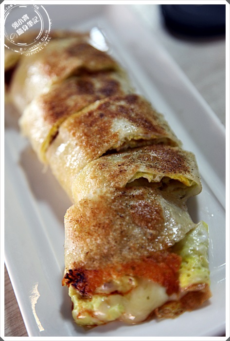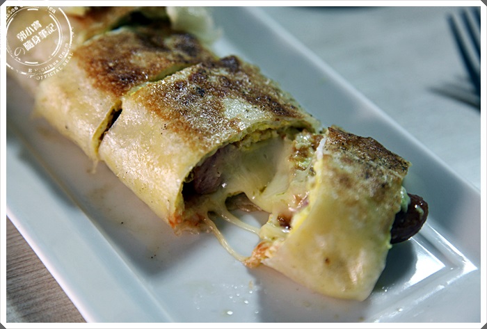 蛋餅外皮焦的焦脆咬下去還有咖滋的聲音,內餡包裹著一整條的德式香腸,中間還包了滿滿了起司,每一口都讓人相當的滿足,這就是所謂的三種味道一次滿足嗎??
