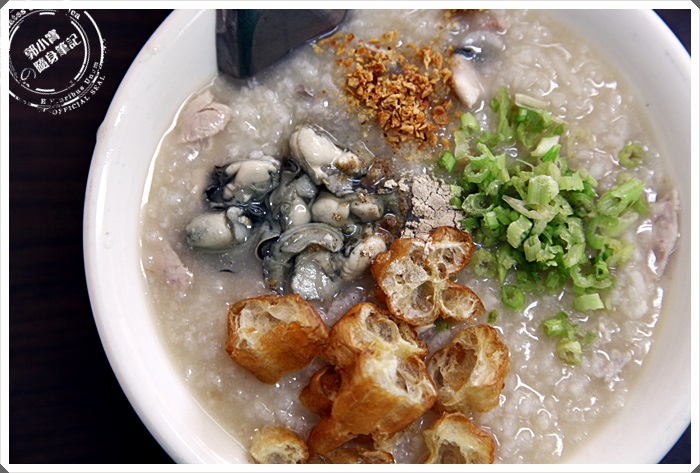 | 這是朋友點的基本款,裡面的料還滿實在的,有很多的鮮蚵根油條,在灑上一些蔥花根蔥酥,粥裡面似乎還有一些虱目魚肉。 |