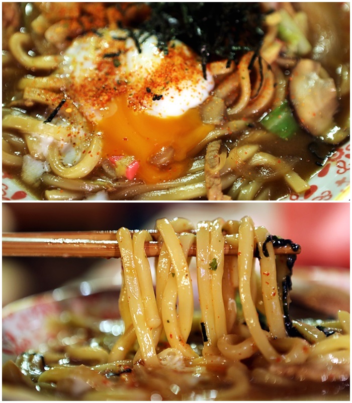 | 炒烏龍麵有著滿滿的料,高麗菜、肉絲通通都有超豐富的,還有一個半熟的荷包蛋才是經典,劃破蛋黃讓蛋黃跟烏龍麵拌在一起就超級好吃,讚岐烏龍麵本身的口感就很好又彈牙,加上湯汁跟蛋液緊緊的巴在烏龍麵上,帶點鍋氣真的非常美味!!! |