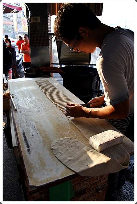 | 邊吃著蛋餅油條邊看著一旁的大哥在製作蛋餅皮,好像看特技一樣的一張張往空中甩,因為蛋餅皮是手工現作,所以才會讓口感那麼的好。 |