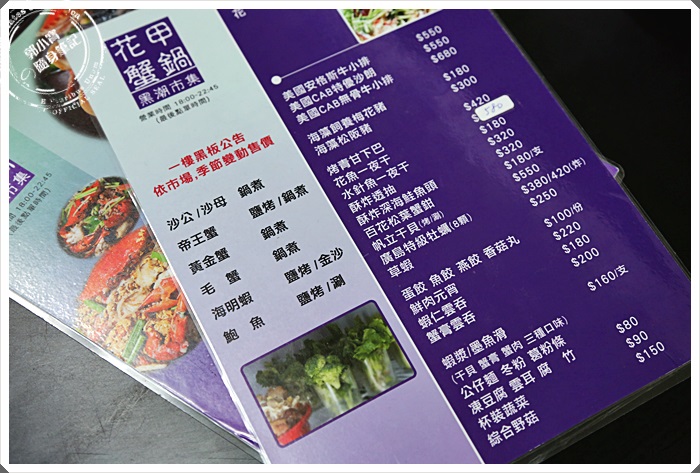 花甲蟹鍋的價位幾乎都是時價居多,其他的熱炒的部分就有固定價錢,菜單的品項相當的多,有一些菜色會是店員當天推薦的特別款。 |