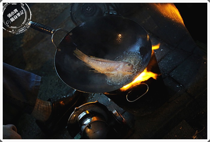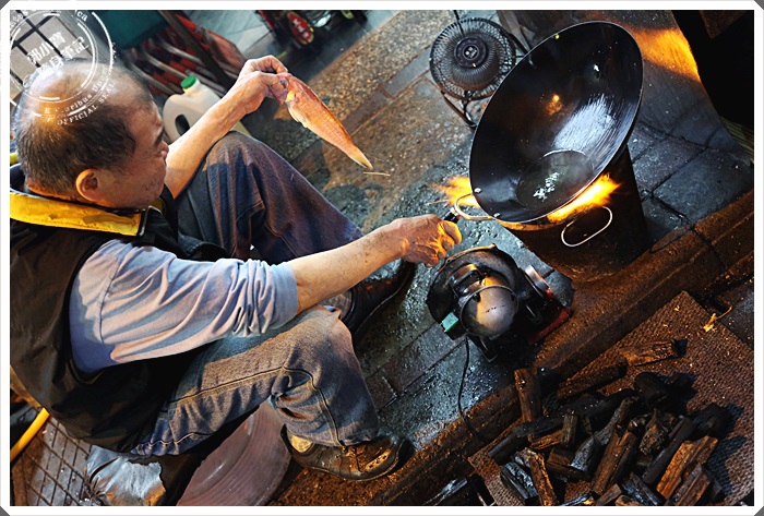 | 阿美古早味的熱炒都是老老闆親自在一旁用炭火爐加風管炒出來的,真的相當的特別,手中握的證是我們點的招牌馬頭魚! |