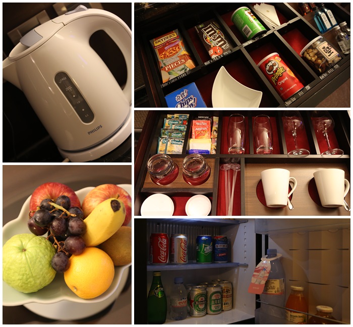 茶水櫃的部分也準備的相當的齊全,第一層的餅乾櫃都是需要付費的,上面都有註明價錢,第二層的茶包跟咖啡包都可以免費使用,冰箱裡面的飲品也都是需要付費,準備的相當齊全。