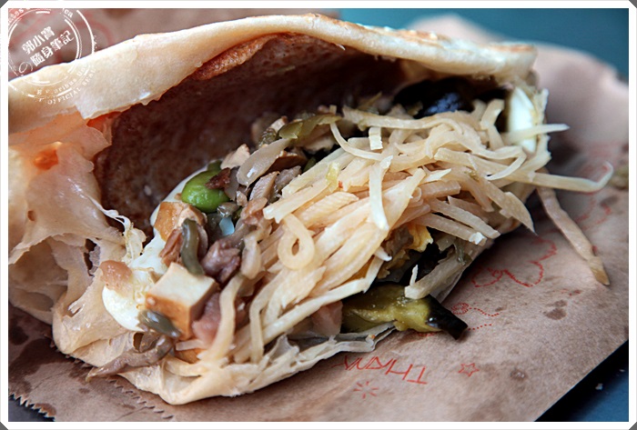 | 大家最喜歡的就是理面的黑輪片,有誰想到黑輪片跟燒餅可以結合再一起,而且一切還那麼的搭口,除了有一顆厚蛋以外,當然還有主角黑輪片,辣豆乾跟榨菜、小黃瓜等,看起來組合就超無敵的啊!! |