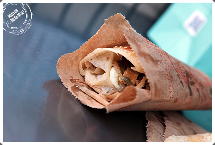 | 捲起來一口咬下口感層次超級豐富的,燒餅外皮嚼勁比較足,有點要用撕咬的口感,加上黑輪本身沒有太大的味道,但是黑輪加上燒餅都非常的耐嚼,搭配辣炸菜跟厚蛋讓整體的豐富性相當的夠,個人超愛這種超豐富的口感。 |