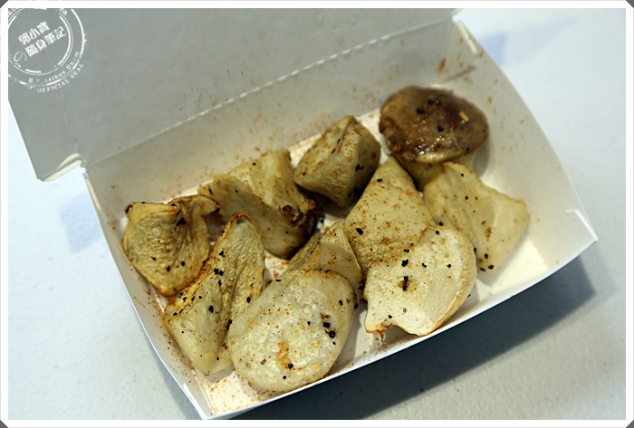 | 這是這麼小小一攤的汪小菇,光是聽名子就知道是菇類產品,大概也是杏鮑菇之類的,這次我們幾個人一起來,剛好遇上老闆們剛開店。 |