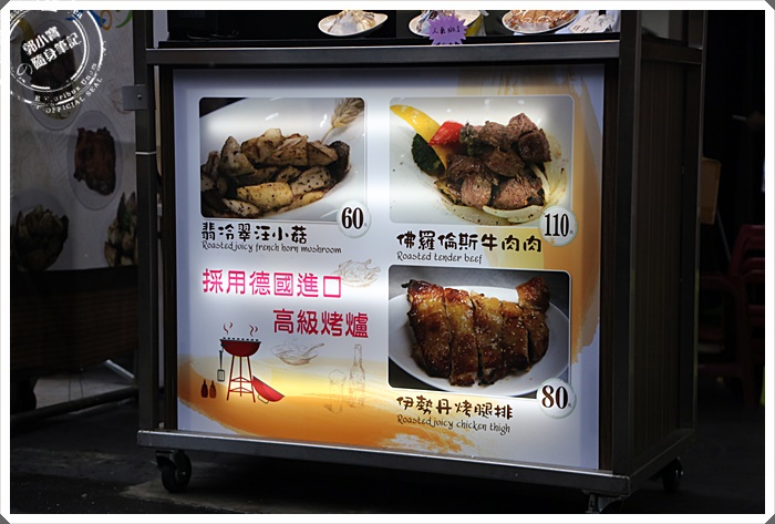 | 這邊最主要販售的商品有汪小菇、牛肉肉、雞腿排三種,怎麼看確實都很難引起我的興趣,要不是有人推薦帶路的話,說真的我經過我也幾乎不會多看一眼,這時候仔細看了一下LOGO後才發現,杏鮑菇根雞坐在牛身上,其實對設計來說這真的很沒有主題,有點搞不懂它們在賣甚麼。 |
