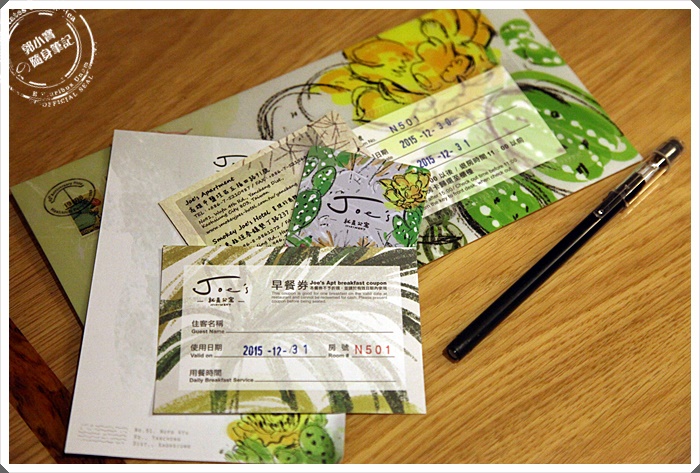 | 辦理好入住手續後,櫃台人員給了我一個防水的塑膠製信封袋,上面的圖案是就是公寓的形象圖,裡面有便條紙跟兩張房卡還有早餐卷。 |