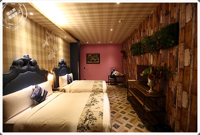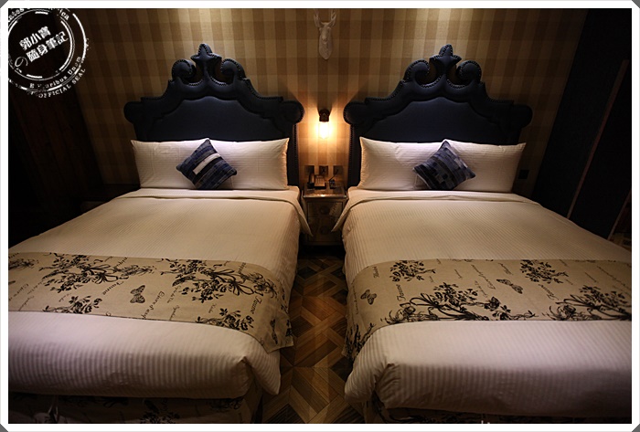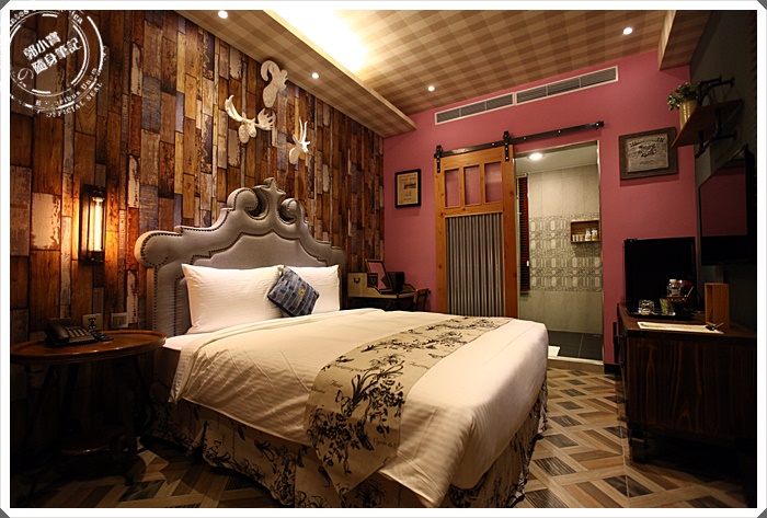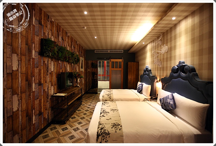 | 兩人房的空間超讚,好友歐洲旅店個風格,暖色系的木頭壁紙加上公主床的床頭板,鋁門拉門,格子紋天花板,很有氣氛,每一間房間的家具也都是不一樣的,都是設計師特別挑過的。 |