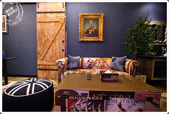 我超愛客廳的拼接圖沙發,看起來超時尚的阿,桌子是仿舊大皮箱,通往房間的門是木拉門,相當有質感。
