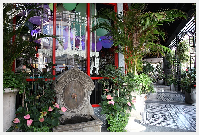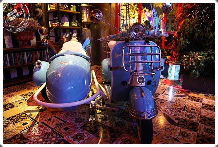 | 大廳內布置了很多仿植栽,又帶著一點都市叢林感,淡藍色的復古偉士牌摩托車,仿舊的斑花地磚質感一整個超搭的,這一樓大廳的空間真的超酷的。 |
