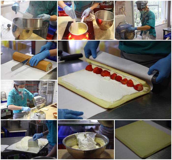 其實看完一整個過程才真正了解到十勝生乳捲真的要很費工,草莓是每天新鮮現送,可以看到草莓真的都很大顆,在外面看到我口水都快流下來了。 |